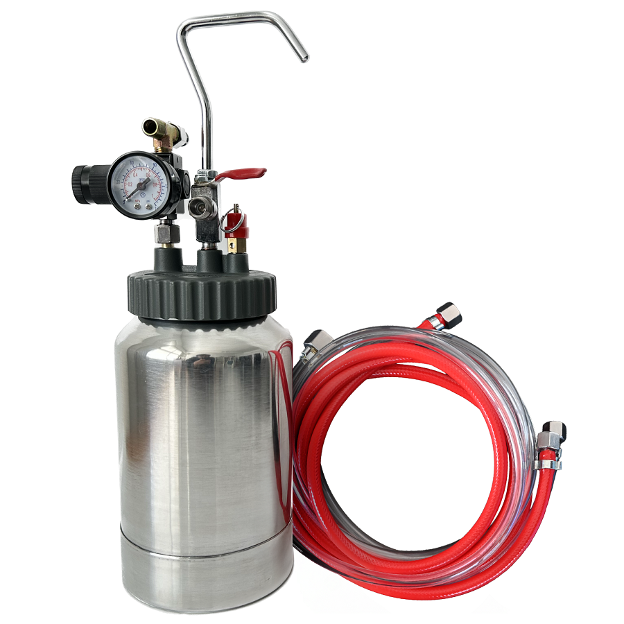 Serbatoio sotto pressione da 2L compreso di tubi aria e fluido da 2m. Questo serbatoio è dotato di un regolatore di pressione del fluido per impostazioni precise.
